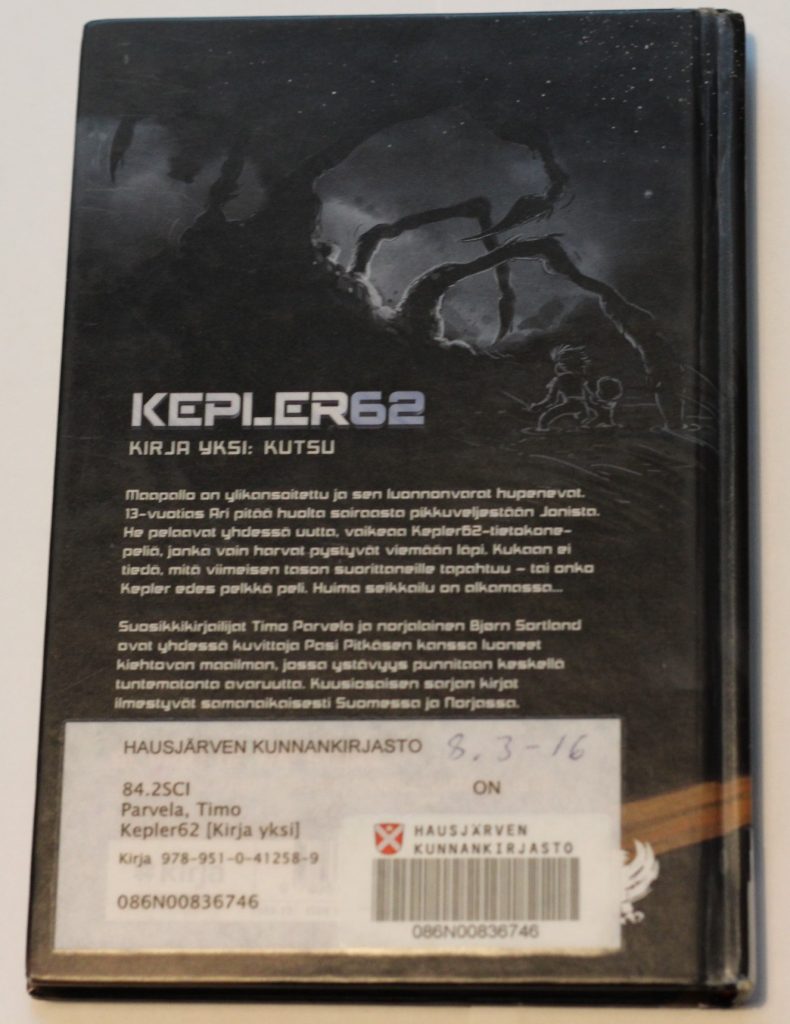 Olen aiemmin yrittänyt kuunnella yhtä Kepler62 sarjan kirjaa, mutta se ei onnistunut koska tuntui liian korkea lentoiselta. Kirjan kuitenkin luin yhdellä istumalla. 🙂 Kirja on helppolukuinen ja iso tekstinen. Kirjan maailmaa ja hahmoja avataan kirjassa hyvin. Kuvat ovat hyvä tuki tekstille. Kyseessä on sarjan ensinmäinen kirja joten avoimia kysymyksiä jää. Suosittelen aloittamaan ensinmäisestä kirjasta koska tarinaan syntyy silloin joku tolkku.