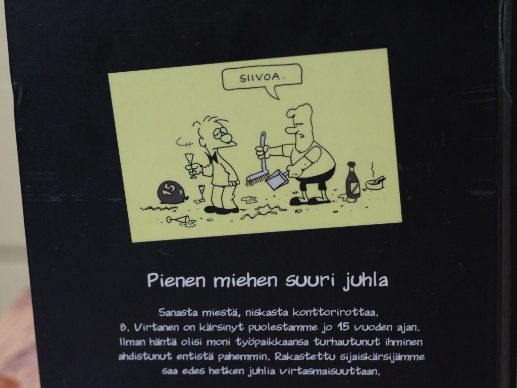 Kirja on juhla teos. B.Virtanen on kirjan valmistumisvuonna 15- vuotta ilahduttanut meitä lehdissä. Kirjassa on erilaisia osioita, kuten Virtasen elämän alku ennen toimistoa. Lisäksi on Virtasen toimisto aika ja muita Ilkka Heilän tekemiä sarjakuvia. Lopussa on myös onnitteluja muilta sarjakuvan tekijöiltä.